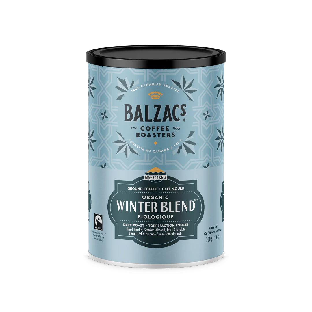 Balzac's - Organic Winter Blend Ground Coffee (Tin) Sale! from 1998 /per Qty. Add to Cart 300g Dark Roast - Smoked Almond, Dried Berries, Dark Chocolate 100% Canadian Roasted 100% Arabica Ground Coffee Tweet
