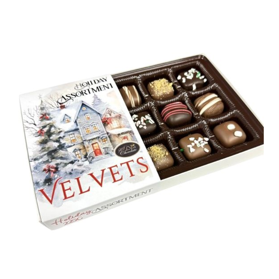 Chocolate Velvets are little bite-sized bursts of indulgence. Each chocolate features a soft, melt-in-your-mouth center, surrounded by a delicate shell of rich chocolate. Flavours include - Hot Chocolate, Cranberry, Candy cane, Orange & Egg Nog