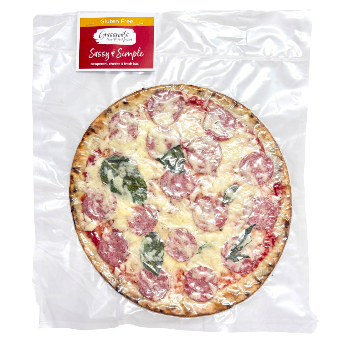 Grassroots Woodfired Pizza - Gluten Free Sassy & Simple (pepperoni, cheese + fresh basil)